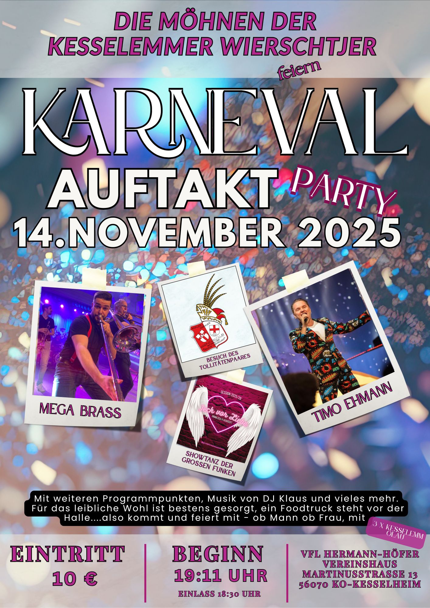 Am Freitag, den 14. November 2025, heißt es wieder: Karneval kann kommen!Die Möhnen der Kesselemmer Wierschtjer laden herzlich zur großen Karnevalsauftakt-Party im VfL Hermann-Höfer Vereinshaus